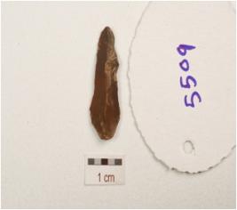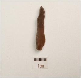 | Description / विवरण | Blade made on chert, prominent bulb on ventral side, single ridge on dorsal side, triangular in cross section, use wear marks on cutting edge. |