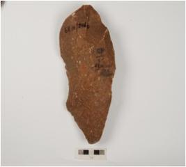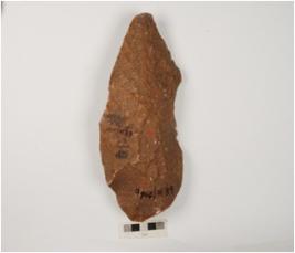 | Description / विवरण | A hand axe, bifacial, made on quartzite with prepared platform, flake scars on both sides, one thick butt end and one pointed end with irregular retouches on working edges. |