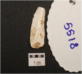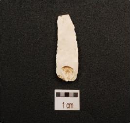 | Description / विवरण | Blade made on chert with double ridge on dorsal side, prominent bulb on ventral side, use wear marks along the cutting edge, trapezoid section. |