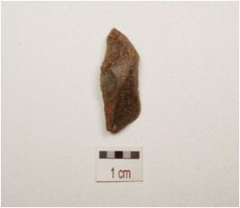 | Description / विवरण | Blade made on chert with single ridge, prominent bulb on ventral side, use wear marks along the working edge, trapezoid section. |
