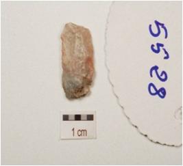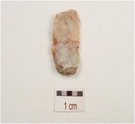 | Description / विवरण | Fragment of blade made on chert prominent bulb on ventral side, double ridge on dorsal side, distal end is partly broken, use wear marks along the working edge. |