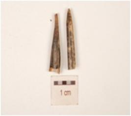 | Description / विवरण | Charred bone point, broken into 2 pieces, has both the ends pointed and polished surface. |