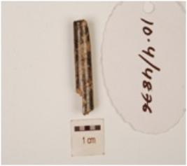 | Description / विवरण | Fragment of a charred bone point, has polished surface and chipped off sides. |