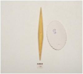 | Description / विवरण | A bone point with polished surface, pointed at both ends, thick in centre and cream in colour. |