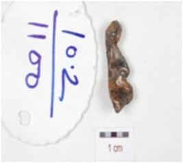 | Description / विवरण | A fragment of copper fish hook, uneven shaped and rough surface. |