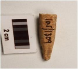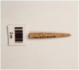 | Description / विवरण | A bone point fragment with broken pointed end, incised marks on surface. |
