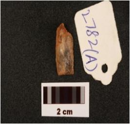| Description / विवरण | Fragment of parallel sided mesolithic blade with use wear marks on edges, a mid-ridge on dorsal surface, triangular in section, diffused bulb on ventral surface. |