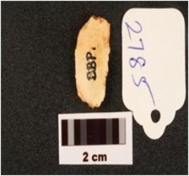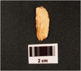 | Description / विवरण | A parallel sided mesolithic chert blade with use wear marks on cutting edges, prominent bulb on ventral surface, three blade scars on dorsal surface, broken distal end. |