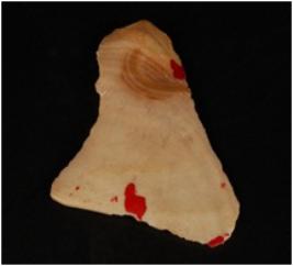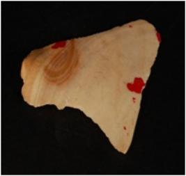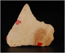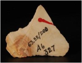| Description / विवरण | Chert flake with smooth surface, uneven ridges, bands and use-wear marks along the cutting edges bulb on ventral side. |