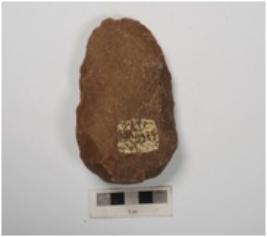 | Description / विवरण | A cleaver made on quartzite, end-struck flake with flake scars on both side, prepared platform, diffused bulb on ventral and use wear marks on cutting edges. |