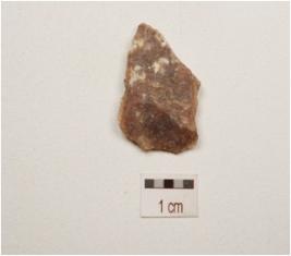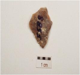 | Description / विवरण | Flake made on chert, flake scars on dorsal side, pointed distal end, use wear mark along cutting edge. |
