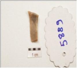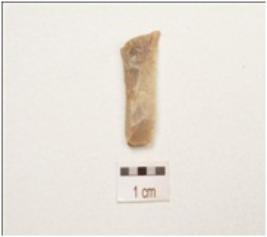 | Description / विवरण | Single sided blade made on chert, end struck flake, bulb absent, broken at one end, sharp cutting edge, use wear marks along the cutting edge, cortex on one side, blade scars on one surface, triangular in section, |