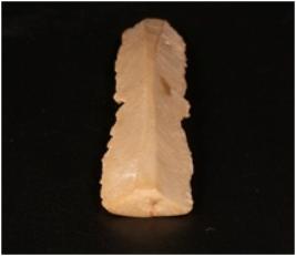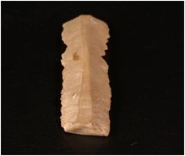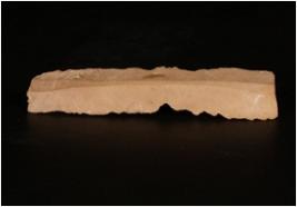 | Description / विवरण | Chert blade with two ridges on the dorsal side, diffused bulb on ventral side, trapezoidal in section and irregular use wear marks along the cutting edges. |