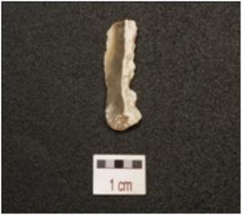 | Description / विवरण | Single sided blade made on chalcedony, end struck flake, bulb absent sharp cutting edge, use wear marks along the cutting edge, cortex on one side triangular in section, |