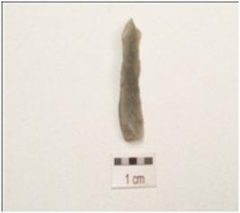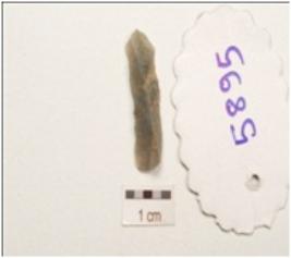 | Description / विवरण | Flake made on chert, end struck flake bulb absent, use wear marks on cutting edge, flat broad one end, pointed other end, flake scars on one surface, triangular in section, |
