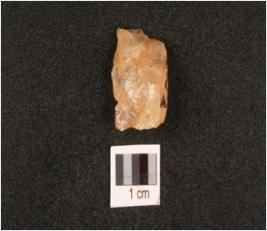 | Description / विवरण | A quartz flake with flake scars on one side. |
