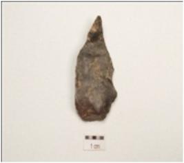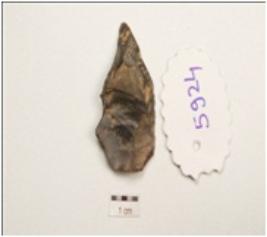 | Description / विवरण | Flake made on chert, end struck flake, prepared platform on proximal end, prominent bulb on ventral surface, pointed one end use wear marks along the cutting edge, flake scars on dorsal surface, triangular in section, |