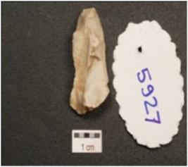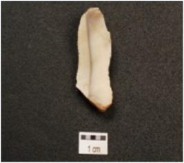 | Description / विवरण | Flake made on chert end struck flake bulb absent, use wear marks along the cutting edge, blade scars on surface triangular in section, |