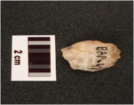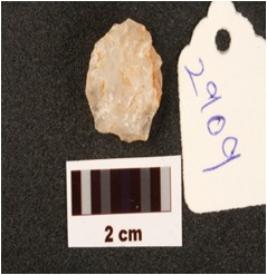 | Description / विवरण | A quartz side scraper made on end struck flake with use-wear marks on edges, prepared platform, flake scars on dorsal surface, prominent bulb on ventral surface. |