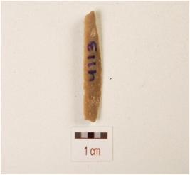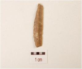 | Description / विवरण | A blade, made on chert with prominent mid-ridge on dorsal side, use-wear marks on cutting edge and triangular in section. |