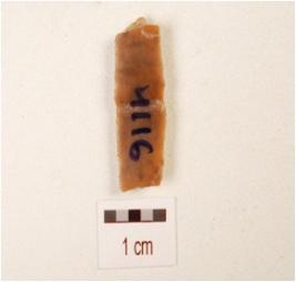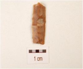 | Description / विवरण | Fragment of a blade, made on chert with double ridge on dorsal side, trapezoid in section and use-wear marks on cutting edge, partly chipped off on dorsal side. |