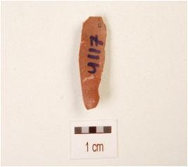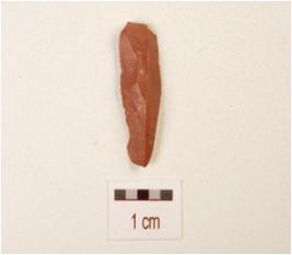 | Description / विवरण | A blade, made on chert with single mid-ridge on dorsal side, prepared platform, bulb on ventral, use-wear marks on cutting edge and triangular in section. |