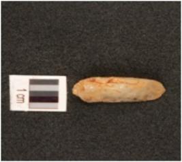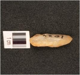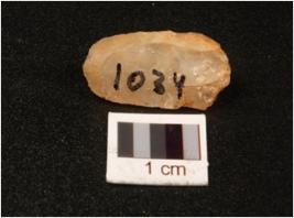 | Description / विवरण | A quartz flake with four flake scars on surface cortex partially visible. |