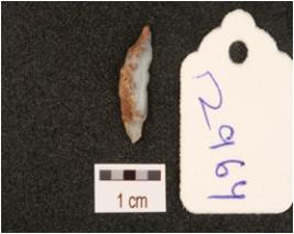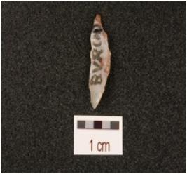 | Description / विवरण | A quartz cresent with both ends pointed, use-wear marks on edges, cortex on dorsal surface, prominent bulb on ventral surface. |