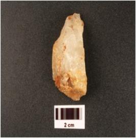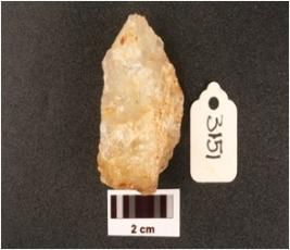 | Description / विवरण | Flake made on quartz with use-wear marks along cutting edges, prepared platform with flake scars on diffused bulb on ventral, cortex is visible on surface. |