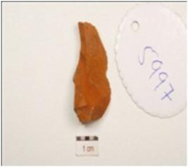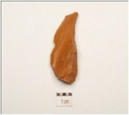 | Description / विवरण | Flake made on chert, flake scars on the dorsal side, smooth and flat ventral side, use wear marks along the cutting edges. |