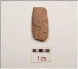 | Description / विवरण | Chert blade with double ridge on dorsal, trapezoidal in section, diffused bulb on ventral , use wear marks on cutting edge and broken along distal end, |