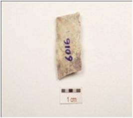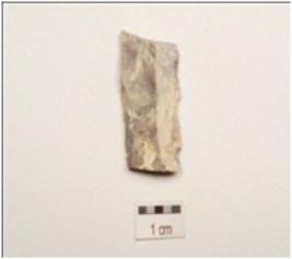 | Description / विवरण | Fragment of parallel sided chert blade with mid ridge on dorsal, triangular in section, use wear marks on cutting edge and broken along both ends, |