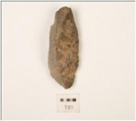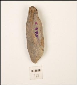 | Description / विवरण | Scraper made by chert, flake scars on the surface, partly retouching on the one cutting edge. |