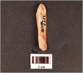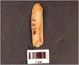 | Description / विवरण | A chert point, bifacial one pointed end broken, straight sided, smooth surface, diffused bulb on ventral surface. |