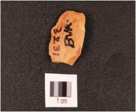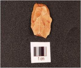 | Description / विवरण | A chert flake, cross flaking on dorsal surface, prepared platform, prominent bulb at distal end. |