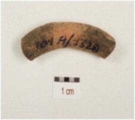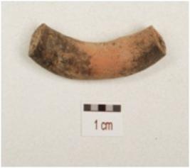 | Description / विवरण | Fragment of a hand made terracotta bangle, made up with fine clay, circular in section, black stairs visible on surface. |