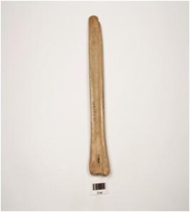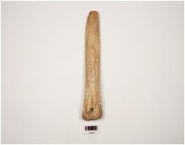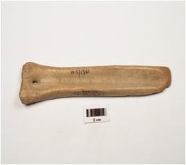 | Description / विवरण | A bone Slicer cutler with convex working end, broad thick other end with a perforation, a groove on one side, other side flat, polished surface, light brown in colour. |