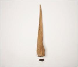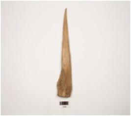| Description / विवरण | A bone point with flat surface from both sides, one end pointed and slightly damaged other end thick and broad, circular on surface, polished, rectangular in section. |