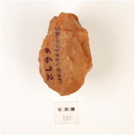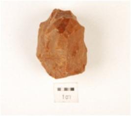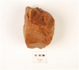 | Description / विवरण | Core made on chert, uneven in shape, flake marks on surface. |