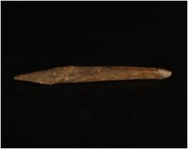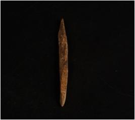 | Description / विवरण | A cherred bone point with pointed ends, one end is broken and other end is intact, ridge along both the ends and polished surface. |