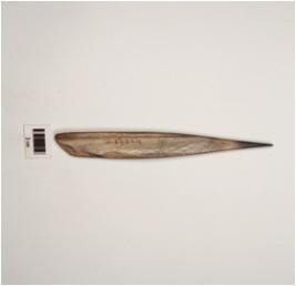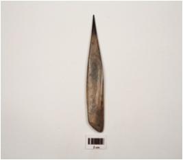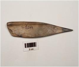 | Description / विवरण | A bone point with flat surface, tapered on one end, charred visible on polished surface, rectangular in section, pointed one end other end broad. |