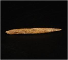| Description / विवरण | A bone point with pointed ends, one end is broken and other end is intact, ridge along both the ends and polished surface. |