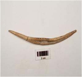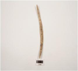 | Description / विवरण | A bone needle with both ends pointed, slightly curved shaped, perforation on middle surface, polished and smooth surface, mended from one side. |