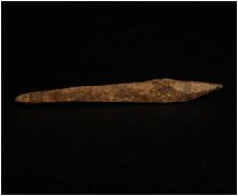 | Description / विवरण | A bone point with pointed ends, one end is broken and other end is intact, ridge along both the ends and polished surface. |