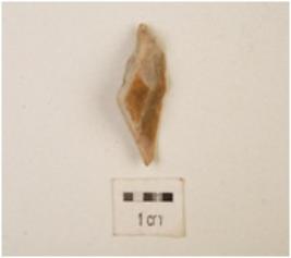 | Description / विवरण | A flake made on chert, flake scars visible on both sides. |