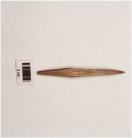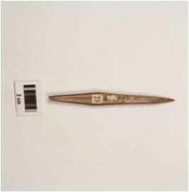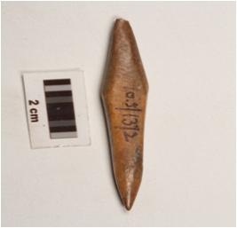 | Description / विवरण | A bone arrow-head with flat surface, pointed one end other end damaged, polished surface, brownish colour. |