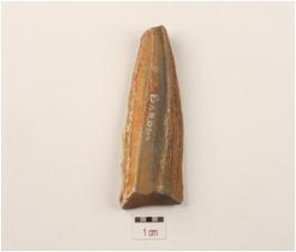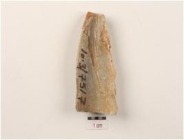 | Description / विवरण | A end struck flake made on chert, flake scars on surface, trapezoidal in section. |