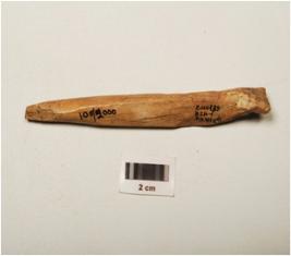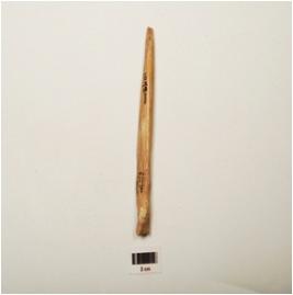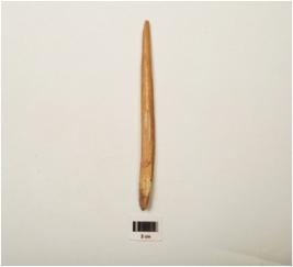 | Description / विवरण | An awl made by a long bone, with smoothly polished surface, one end pointed and damaged, and a natural groove one side, cracked one side. |