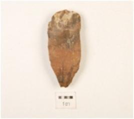 | Description / विवरण | A flake made on chert stone, prominent bulb, flake scars visible on one side. |