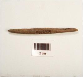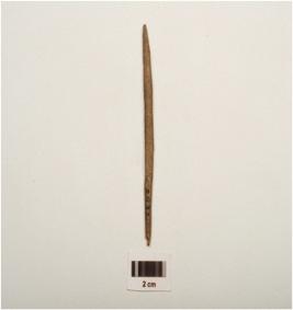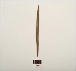 | Description / विवरण | A bone point made by a long bone, pointed both ends but one end slightly damaged, polished surface, circular cross section. |